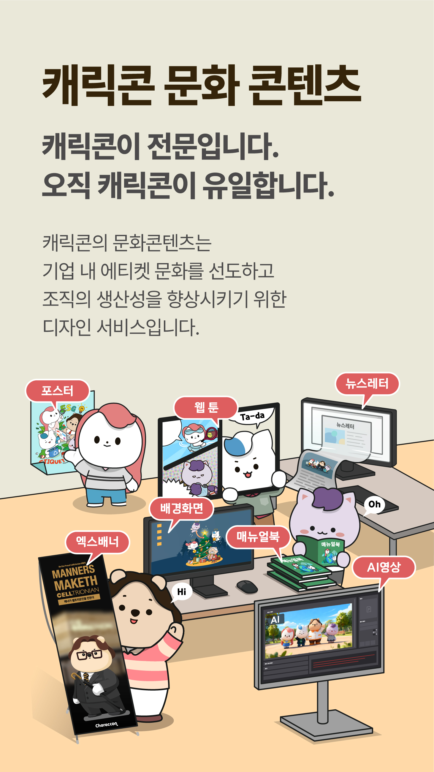 포스터·웹툰·매뉴얼북으로 당신의 조직이 전하고 싶은 메시지를 문화로 만듭니다.
