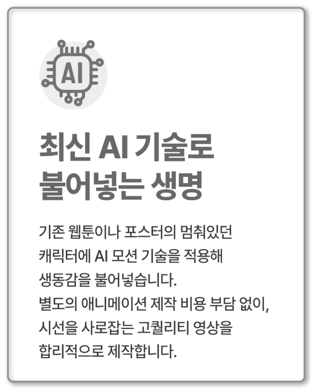 최신 AI 생성 기술을 활용하여 합리적이고 감각적인 영상을 제작합니다.